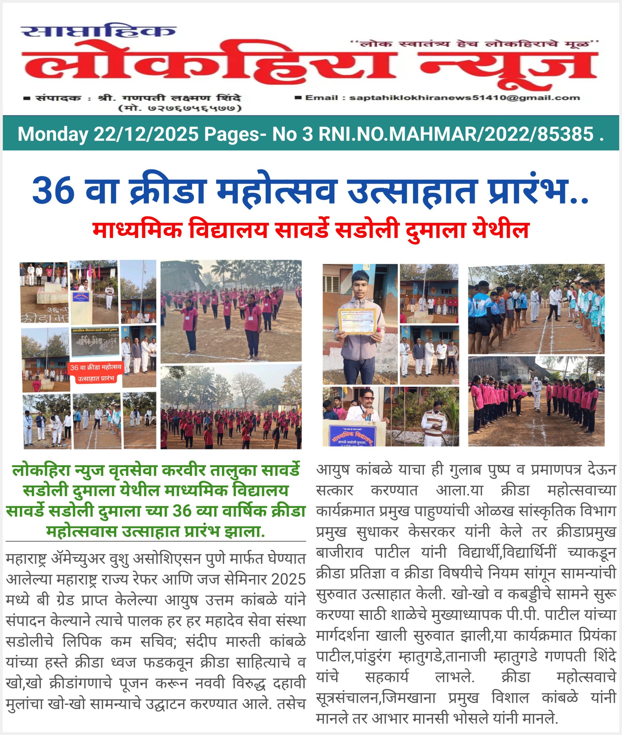 करवीर तालुका सावर्डे सडोली दुमाला येथील माध्यमिक विद्यालय सावर्डे सडोली दुमाला च्या 36 व्या वार्षिक क्रीडा महोत्सवास उत्साहात प्रारंभ झाला. महाराष्ट्र ॲमेच्युअर वुशु असोशिएसन पुणे मार्फत घेण्यात आलेल्या महाराष्ट्र राज्य रेफर आणि जज सेमिनार 2025 मध्ये बी ग्रेड प्राप्त केलेल्या आयुष उत्तम कांबळे यांने संपादन केल्याने त्याचे पालक हर हर महादेव सेवा संस्था सडोलीचे लिपिक कम सचिव; संदीप मारुती कांबळे यांच्या हस्ते क्रीडा ध्वज फडकवून क्रीडा साहित्याचे व खो,खो क्रीडांगणाचे पूजन करून नववी विरुद्ध दहावी मुलांचा खो-खो सामन्याचे उद्घाटन करण्यात आले. तसेच आयुष कांबळे याचा ही गुलाब पुष्प व प्रमाणपत्र देऊन सत्कार करण्यात आला.या क्रीडा महोत्सवाच्या कार्यक्रमात प्रमुख पाहुण्यांची ओळख सांस्कृतिक विभाग प्रमुख सुधाकर केसरकर यांनी केले तर क्रीडाप्रमुख बाजीराव पाटील यांनी विद्यार्थी,विद्यार्थिनीं च्याकडून क्रीडा प्रतिज्ञा व क्रीडा विषयीचे नियम सांगून सामन्यांची सुरुवात उत्साहात केली. खो-खो व कबड्डीचे सामने सुरू करण्या साठी शाळेचे मुख्याध्यापक पी.पी. पाटील यांच्या मार्गदर्शना खाली सुरुवात झाली,या कार्यक्रमात प्रियंका पाटील,पांडुरंग म्हातुगडे,तानाजी म्हातुगडे गणपती शिंदे यांचे सहकार्य लाभले. क्रीडा महोत्सवाचे सूत्रसंचालन,जिमखाना प्रमुख विशाल कांबळे यांनी मानले तर आभार मानसी भोसले यांनी मानले.