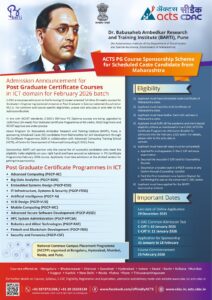 Dr. Babasaheb Ambedkar Research and Training Institute (BARTI), Pune—an autonomous institute under the Department of Social Justice and Special Assistance, Government of Maharashtra—has announced sponsorship for Scheduled Caste (SC) candidates from Maharashtra for skill development through PG Certificate Programmes (PGCP) 2026. The initiative is being implemented in collaboration with the Advanced Computing Training School (ACTS) of the Centre for Development of Advanced Computing (C-DAC), Pune.