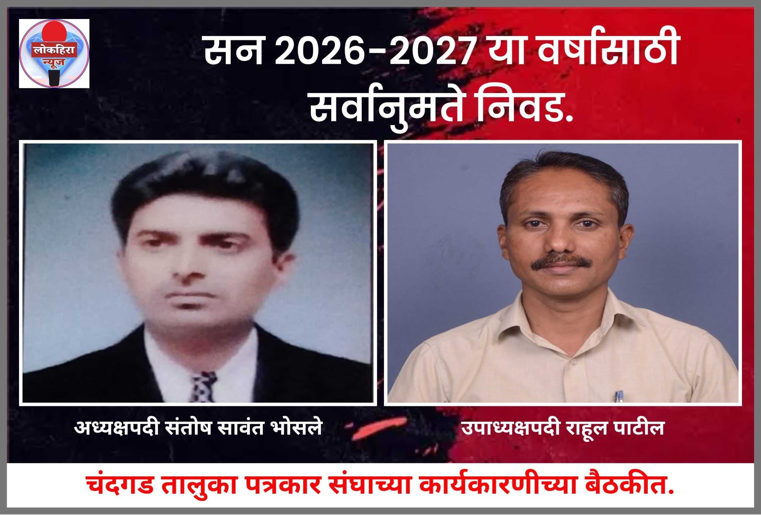 अखिल भारतीय मराठी पत्रकार परिषद सलग्न चंदगड तालुका पत्रकार संघाच्या तालुका अध्यक्ष पदासाठी संतोष सावंत भोसले (संपादक -चंदगड टाईम्स) तर उपाध्यक्षपदी राहूल पाटील (संपादक -सत्यघटना) यांची सन २०२६-२०२७ या वर्षासाठी सर्वानुमते निवड करण्यात आली.