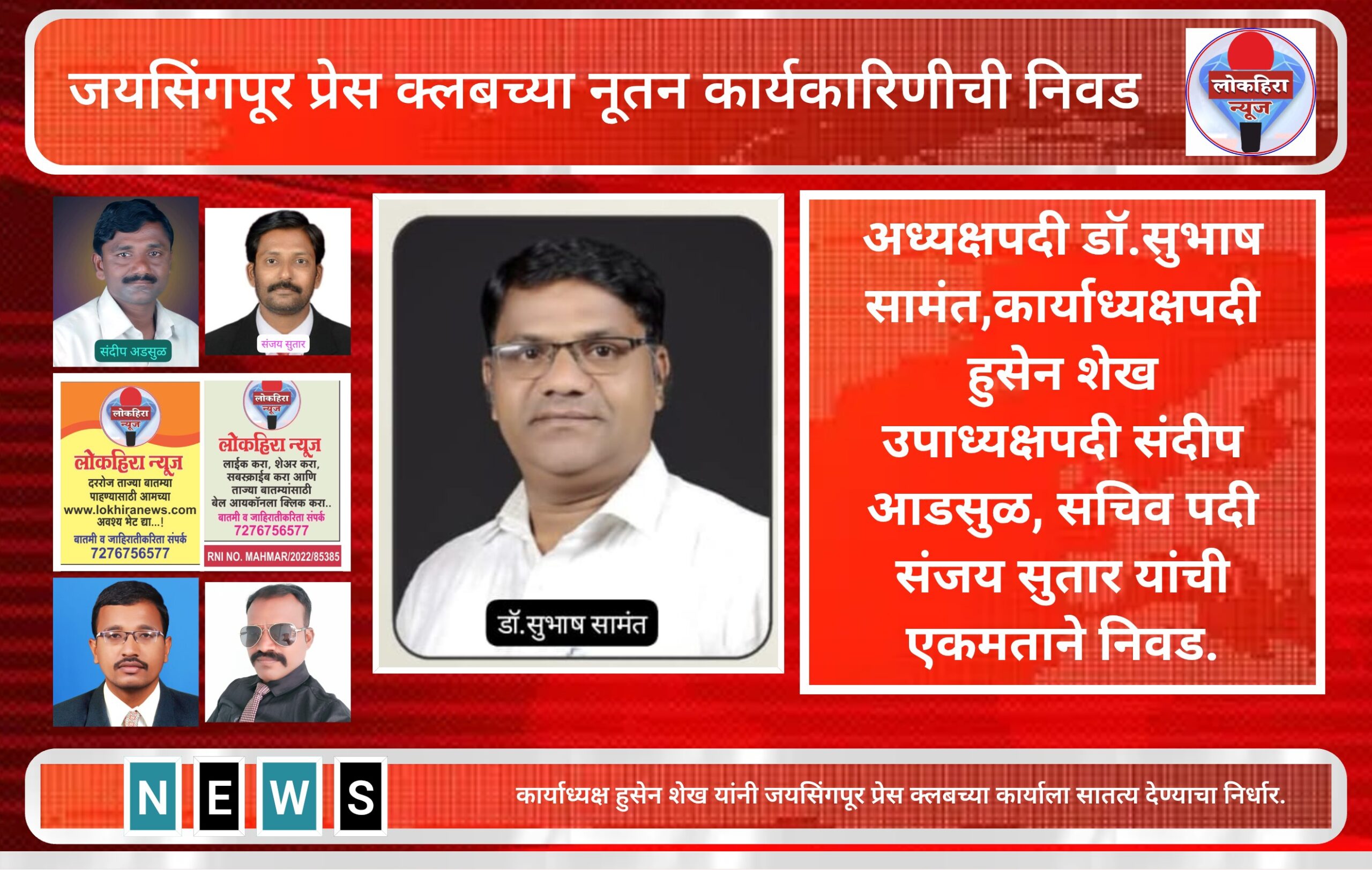 जयसिंगपूर प्रेस क्लबच्या अध्यक्षपदी डॉ. सुभाष सामंत, कार्याध्यक्षपदी हुसेन शेख, उपाध्यक्षपदी संदीप आडसुळ, सचिवपदी संजय सुतार, सह सचिव रोहित जाधव तर खजिनदारपदी विजय धंगेकर यांची एकमताने निवड करण्यात आली. या निवड प्रक्रियेसाठी आयोजित करण्यात आलेल्या सभेच्या अध्यक्षस्थानी रोटरी ट्रेड सिटीचे अध्यक्ष डॉ. अतिक पटेल तर राष्ट्रपती पारितोषिक विजेते हाजी मोहम्मद शफी पटेल ( गुरुजी ) हे प्रमुख पाहुणे म्हणून उपस्थित होते.
