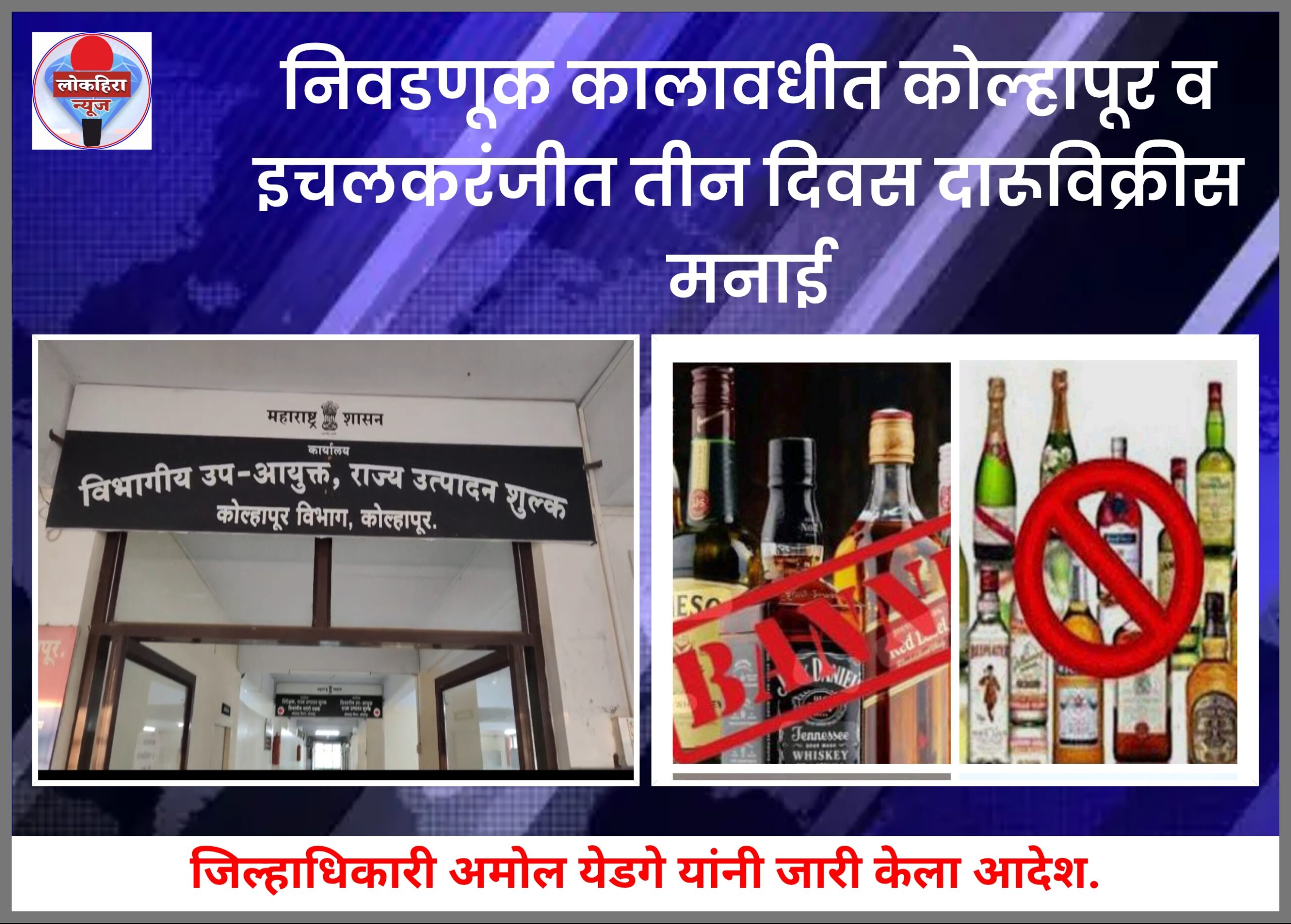 कोल्हापूर आणि इचलकरंजी महानगरपालिकांच्या निवडणूक प्रक्रियेच्या पार्श्वभूमीवर कायदा व सुव्यवस्था सुरळीत राखण्यासाठी जिल्हाधिकारी (राज्य उत्पादन शुल्क), कोल्हापूर यांनी दारूविक्रीबाबत आदेश जारी केला आहे. या आदेशानुसार निवडणूक काळात सलग तीन दिवस मद्यविक्री बंद राहणार आहे.