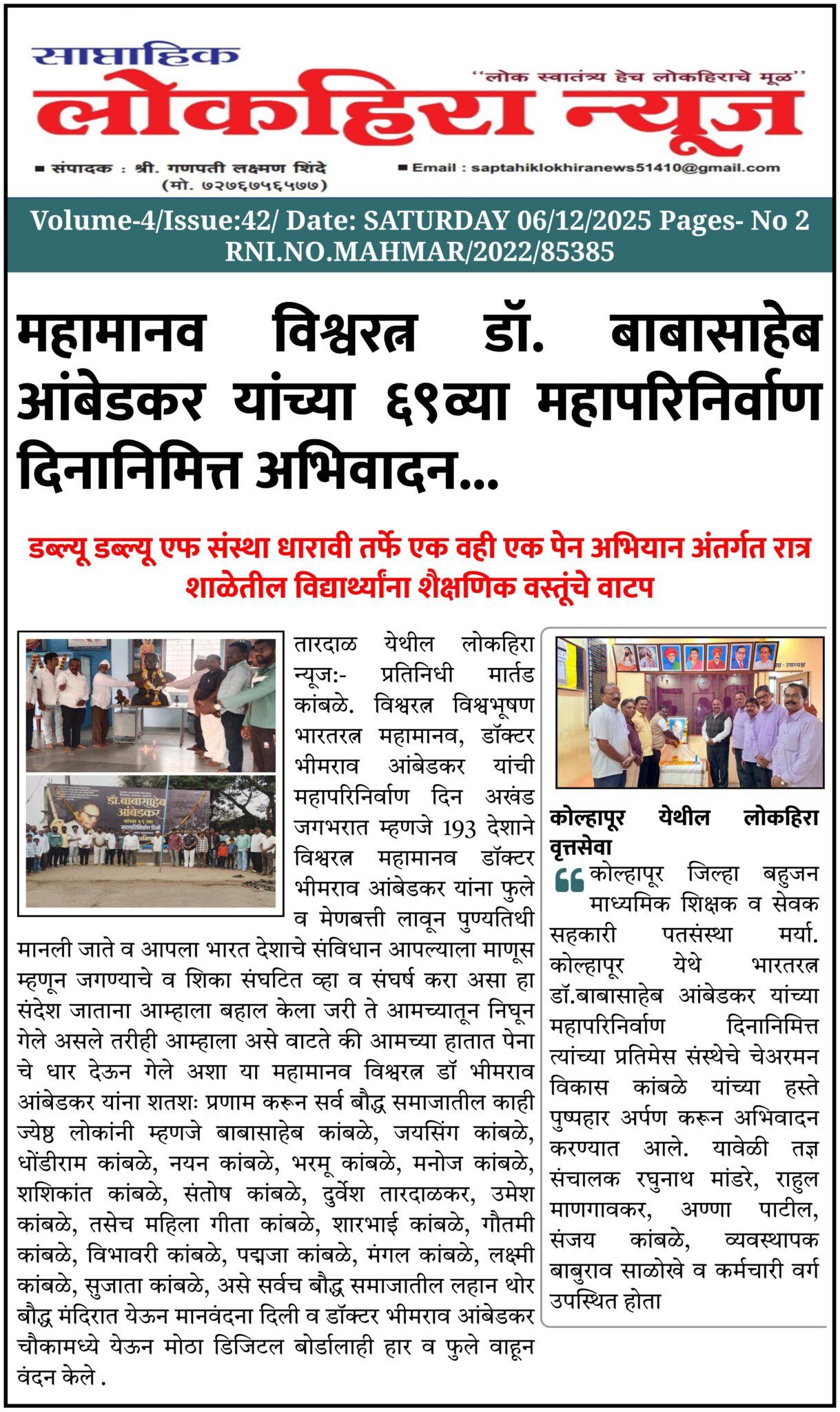घटना तज्ञ डॉक्टर बाबासाहेब आंबेडकर यांच्या 69 व्या महापरीनिर्वाण दिनी सायन हॉस्पिटल समोरील फुटपाथ वर वापरणेयोग्य कपडे वाटून डॉक्टर आंबेडकरांना अभिवादन धारावी झोपडपट्टी पोलीस पंचायत ग्रुप December 6, 2025 No Comments Read More »